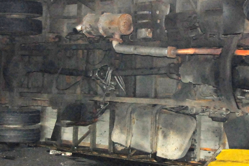넘어진 차 바닥을 잘 보면 샤프트가 밧줄로 묽여 있습니다.