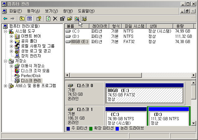 (windows 2000, XP 상에서는 디스크관리자에서 파티션설정)