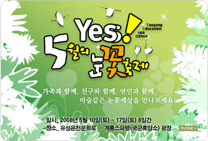 • 우리 동네에서 유성눈꽃축제가 열립니다. 장장 1주일이네요... - 유성눈꽃축제 - 2008. 05. 10 - 17(8일간) - 유성온천문화의 거리, 계룡스파텔 등 - 주요 행사 5/10일 : 전통문화 체험, 각종 문화행사, 이팝콘서트, 불꽃축제 5/11일 : 전통문화 체험, 브라스밴드, 가요제 등 5/12일 : 문화행사, 전통혼례식, 길거리퍼포먼스, 사물놀이 등 5/13일 : 전통문화체험, 풍물, 마임 쇼, 마술 등 5/14일 : 전통문화체험, 드럼패스티벌 등 5/15일 : 전통문화체험, 비보이댄스 등 5/16일 : 전통문화체험, 상모, 대북 공연 등 6/17일 : 전통문화체험,...