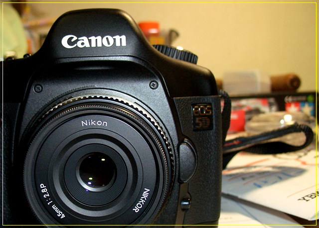 캐논 5D에 니콘 팬케익 45mm를 마운트해 봤습니다.