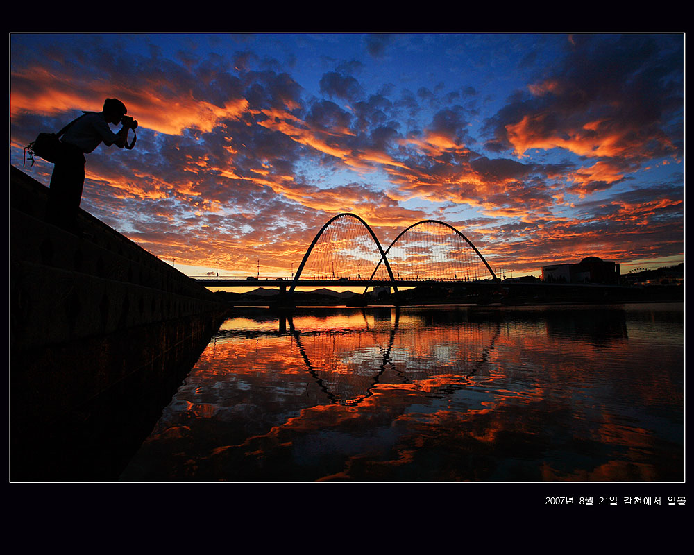 갑천에 비췬 황홀한 구름 반영, 내려다 보며 촬영에 열중하는 진사와 바나나다리의 배치가 역동적이고 화려합니다.
