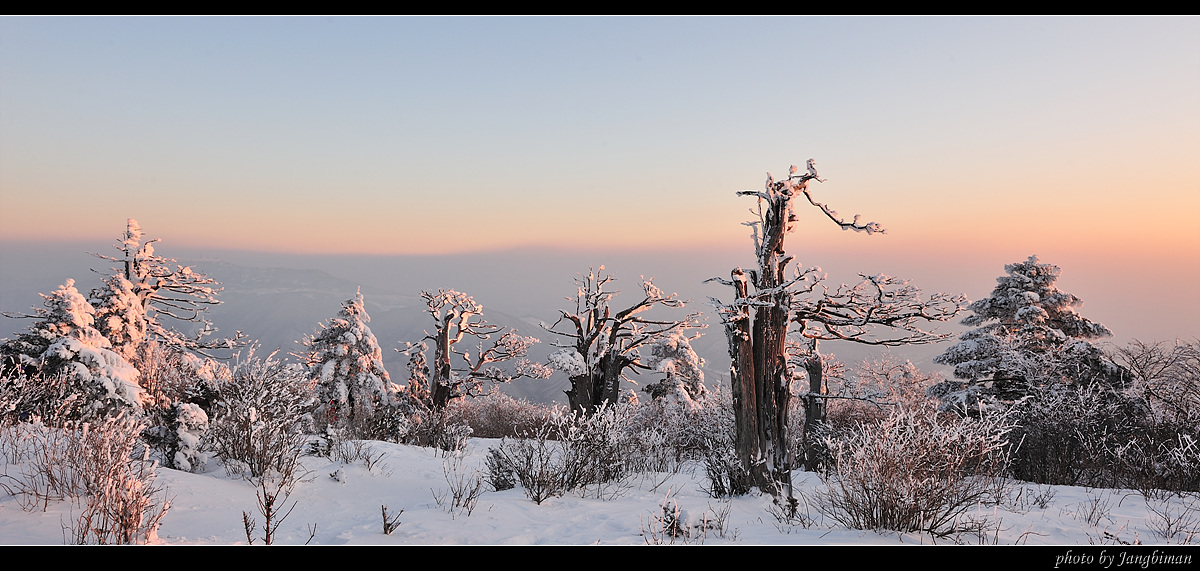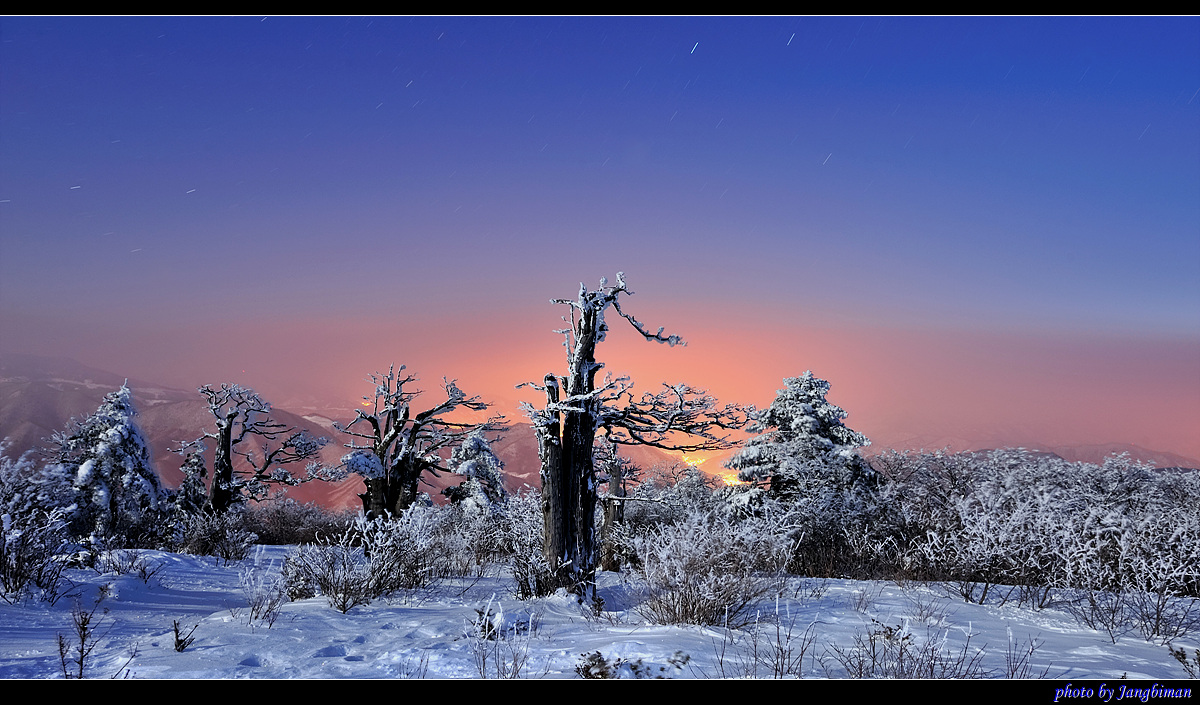 6시경 주목군락지에 도착해 보니, 바람이 거세게 불어서 그런지 예상했던 대로 운해는 없고, 땀이 식으면서 추위가 엄습했습니다. 영하 20도가 훨씬 넘는 날씨에 먼저 도착해서 기다리고 있던 지인 옆에 가서 삼각대를 펴고, 장노출로 몇 장 담아보았습니다. 이후 시간이 조금 지나자 진사님들이 무척 많이 올라오시더군요... ^^*
