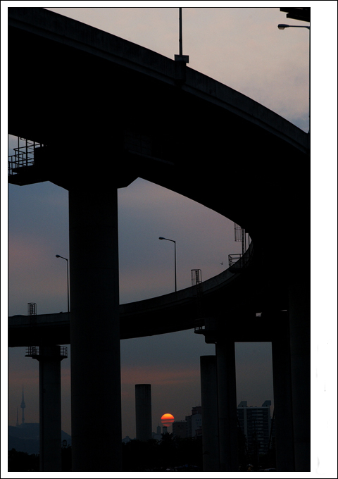 지는 해와 도시 모습이 잘 어울립니다.