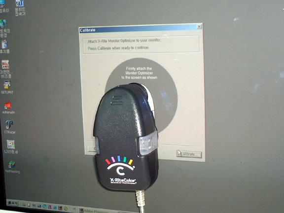 ..next.. 밝기와 대비를 이용해 1~4, 10~7 까지의 그레이 패치들을 구분이 돼게 모니터 OSD를 이용해 조정을 하라 더군요, 여기서 10 and 9 간의 그레이 패치는 거의 구분이 안되게조정을 했습니다 (10은 모니터의 RGB가 주사되지 않는 검정 그리고 9는 RGB가 오버레이 되는검정 글케 알고 있고 있거든요 <= 요부분 딴지 환영^^;)next 사진처럼 센서를 머니터에 촦~ 하고 붙힌다 붙히기전에 모니터를 깨끗하게 닦으셔야 합니다 (안닦아도 큰 차이는 없지만요^^;;;;)
