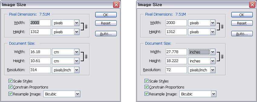 제 카메라의 해상도는 2000*1312라서 314dpi로 설정하면 1:1 사이즈가 4-6사이즈 밖에 되질 않네요.